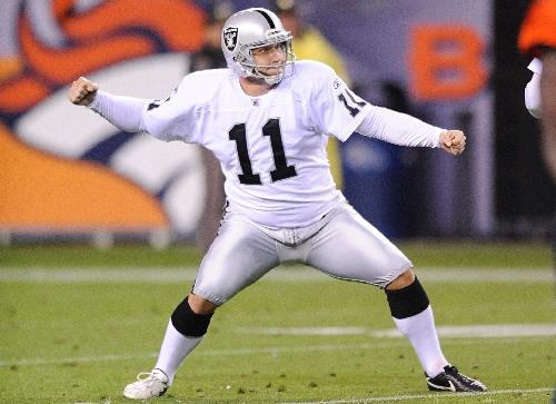 The Raiders had gotten the ball with 24 seconds left in the half when safety Matt Giordano intercepted a pass thrown by Orton at the Raiders 24. A 15-yard facemask on Broncos defensive tackle Kevin Vickerson, one of 16 first-half penalties — eight by each team — helped Janikowski move into range.