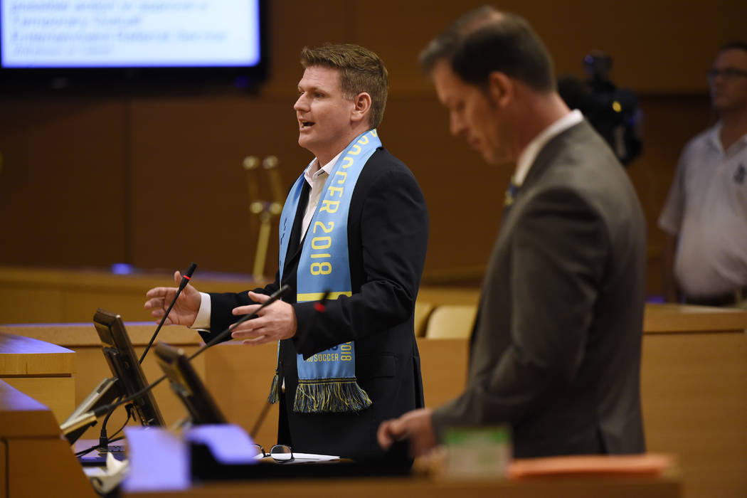 Founder and President of Las Vegas Soccer LLC. Brett Lashbrook makes his presentation during a meeting of the Las Vegas City Council Wednesday, July 19, 2017. Sam Morris/Las Vegas News Bureau