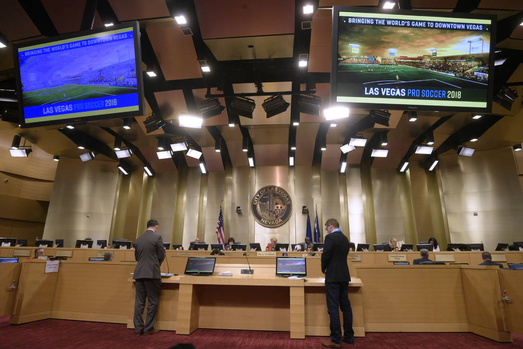 City of Las Vegas Director of Economic and Urban Development Bill Arent, left, and Las Vegas Soccer LLC founder and president Brett Lashbrook make a presentation during a meeting of the Las Vegas City Council Wednesday, July 19, 2017. Sam Morris/Las Vegas News Bureau