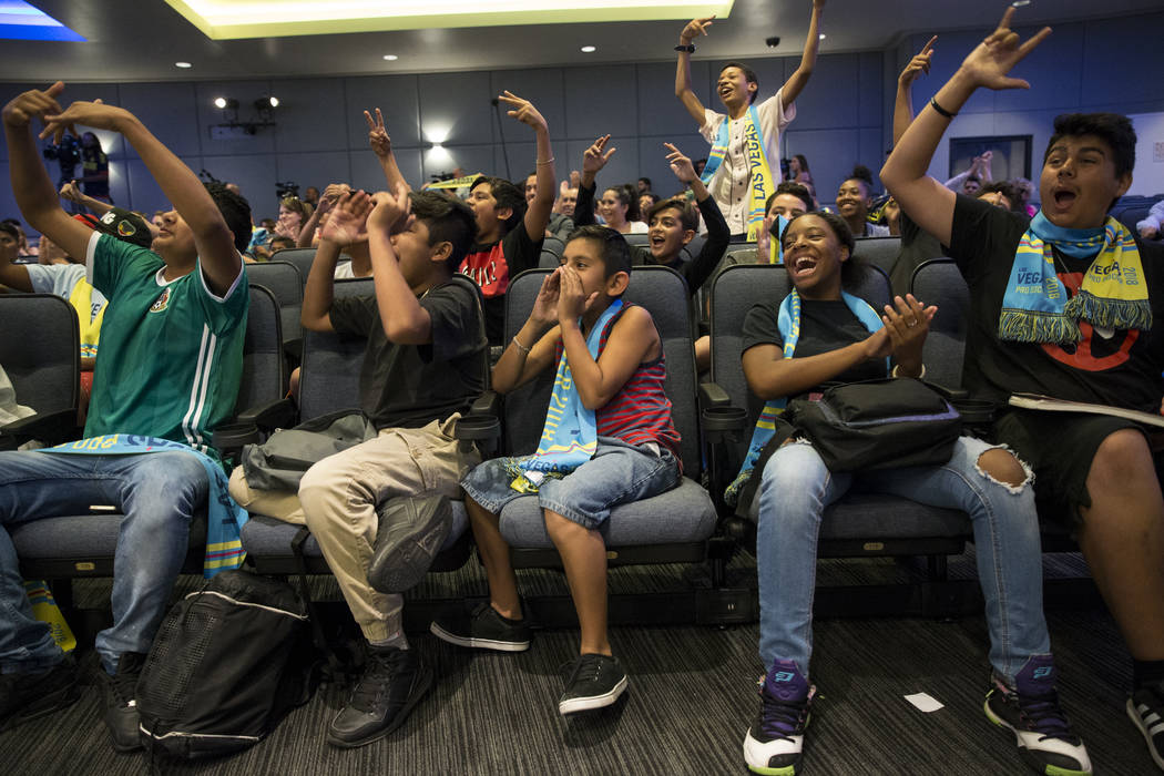 Children with the Boys & Girls Clubs of Southern Nevada from left, Christopher Ramirez, 13, Mark Cortez, 12, Samuel Seoane, 11, Amiyah Jordan, 14, and Sebastian Manzo, 15, cheer during an United Soccer League event to celebrate the newest team in the league at the Zappos campus in Las Vegas on Friday, Aug. 11, 2017. Erik Verduzco Las Vegas Review-Journal @Erik_Verduzco