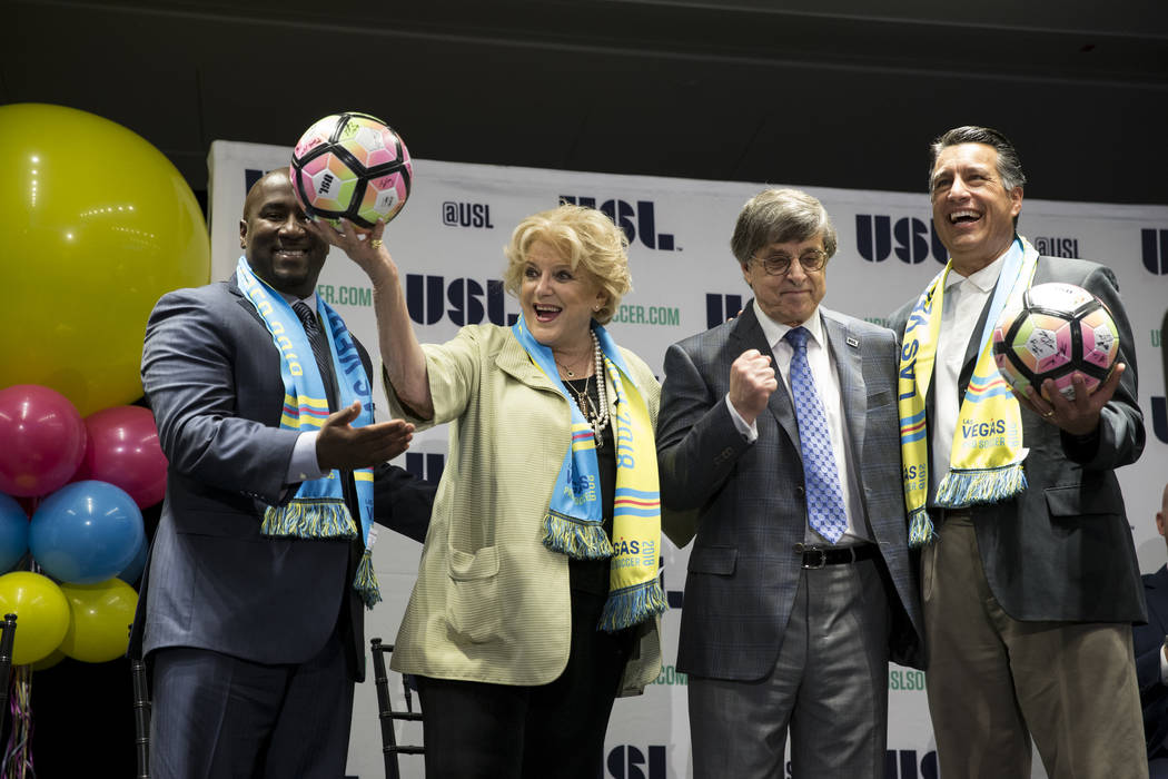 Las Vegas Councilman Ricki Barlow, from left, Mayor Carolyn Goodman, CEO of the United Soccer League Alec Papadakis, and Governor Brian Sandoval during an USL event to celebrate the newest team from Las Vegas in the league at the Zappos campus in Las Vegas on Friday, Aug. 11, 2017. Erik Verduzco Las Vegas Review-Journal @Erik_Verduzco