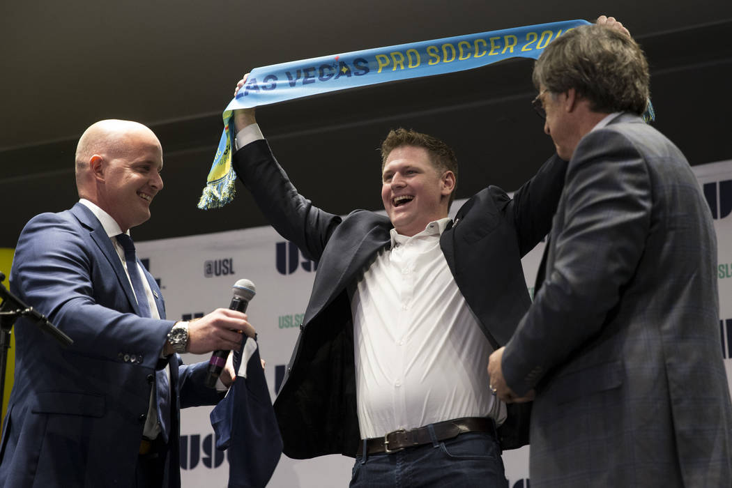 United Soccer League president Jake Edwards, left, and CEO Alec Papadakis, right, look on as Brett Lashbrook, founder of Las Vegas Soccer LLC, celebrates his new Las Vegas soccer team to play in the USL during an event at the Zappos campus in Las Vegas on Friday, Aug. 11, 2017. Erik Verduzco Las Vegas Review-Journal @Erik_Verduzco