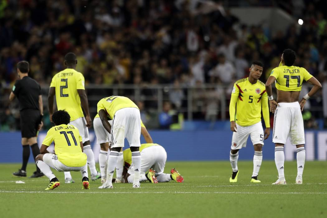 Colombia players react after the round of 16 match between Colombia and England at the 2018 soccer World Cup in the Spartak Stadium, in Moscow, Russia, Tuesday, July 3, 2018. England eliminates Colombia 4-3 on penalties after the game ends 1-1. (AP Photo/Matthias Schrader)