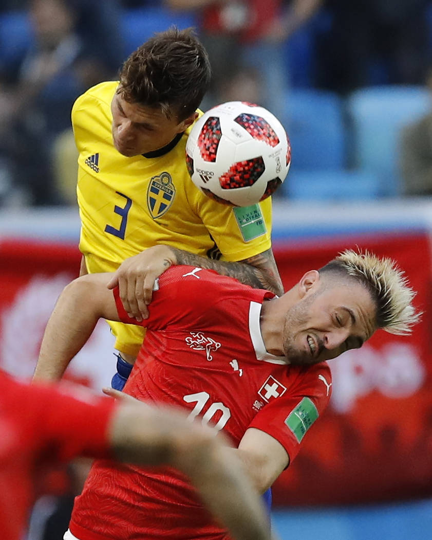 Sweden’s Victor Lindelof, left, heads for the ball with Switzerland’s Granit Xhaka during the round of 16 match between Switzerland and Sweden at the 2018 soccer World Cup in the St. Petersburg Stadium, in St. Petersburg, Russia, Tuesday, July 3, 2018. (AP Photo/Efrem Lukatsky)