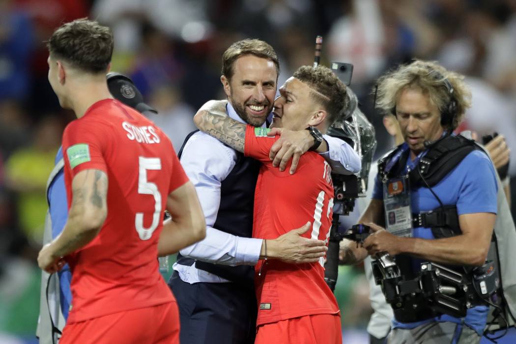 England head coach Gareth Southgate, center, hugs Kieran Trippier after the round of 16 match between Colombia and England at the 2018 soccer World Cup in the Spartak Stadium, in Moscow, Russia, Tuesday, July 3, 2018. England eliminates Colombia 4-3 on penalties after the game ends 1-1. (AP Photo/Matthias Schrader)
