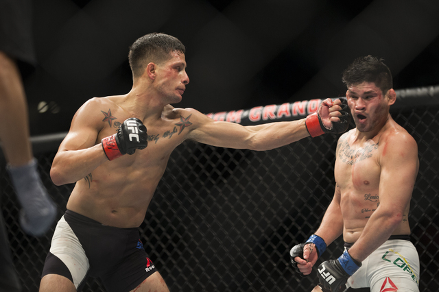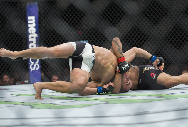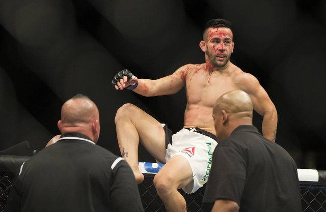 Alvarez rocked Rafael dos Anjos early and unleashed a barrage of punches until referee Herb Dean stopped the fight as dos Anjos was taking blows with his back against the cage at 3:49 of the first round in the main event of UFC Fight Night 90 at the MGM Grand Garden.