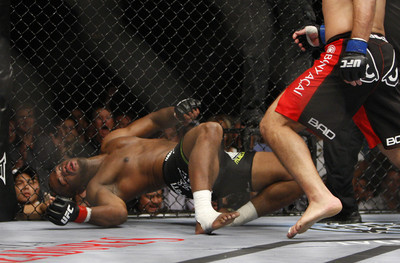 Evans was able to get to his feet, but Machida threw several big punches before finally connecting with a left hook that sent Evans to the floor with his legs folded awkwardly beneath him.