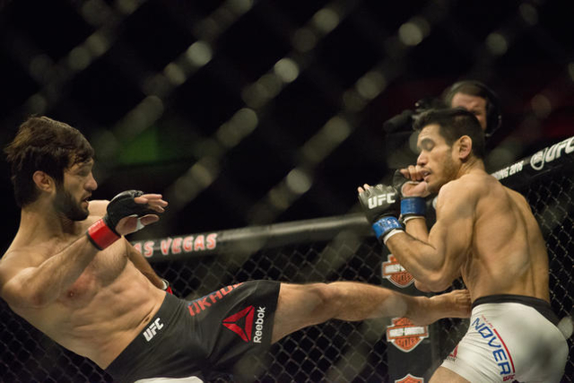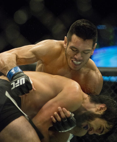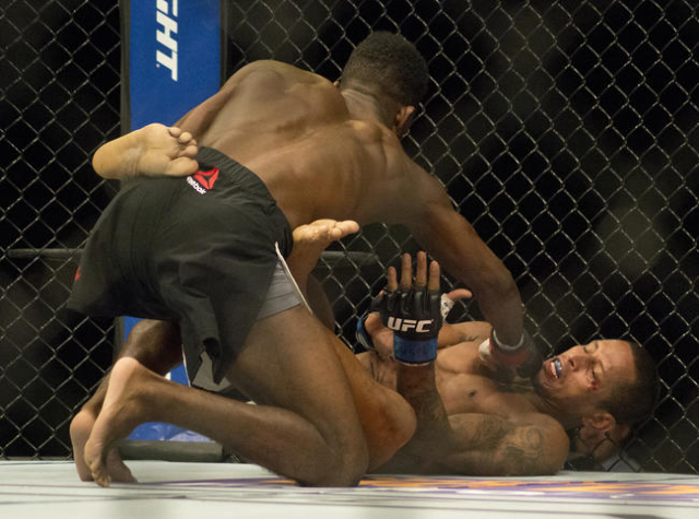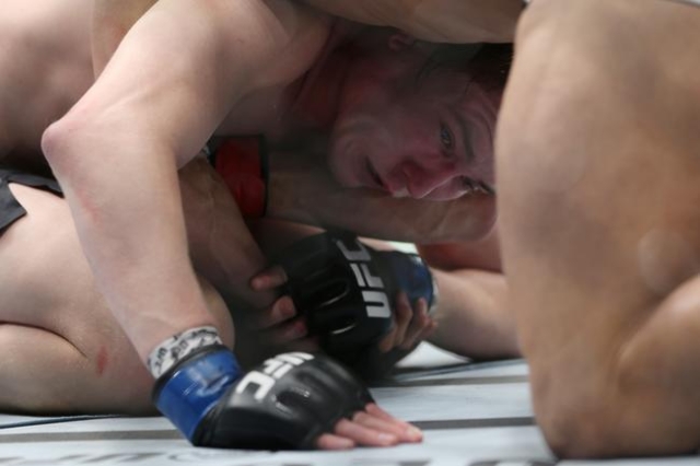 Sterling improved to 12-0 overall and 4-0 in the UFC by securing a guillotine choke after battering Eduardo with punches and elbows on the mat against the cage.
