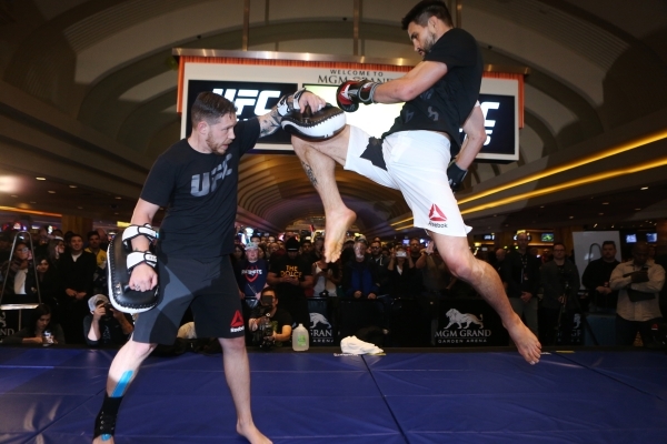 Veteran Ultimate Fighting Championship welterweight Carlos Condit appeared at ease as he played to the crowd during Wednesday’s open media workouts on the casino floor at the MGM Grand in advance of his title bout against champion Robbie Lawler on Saturday.