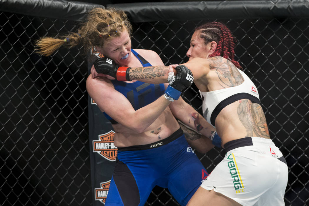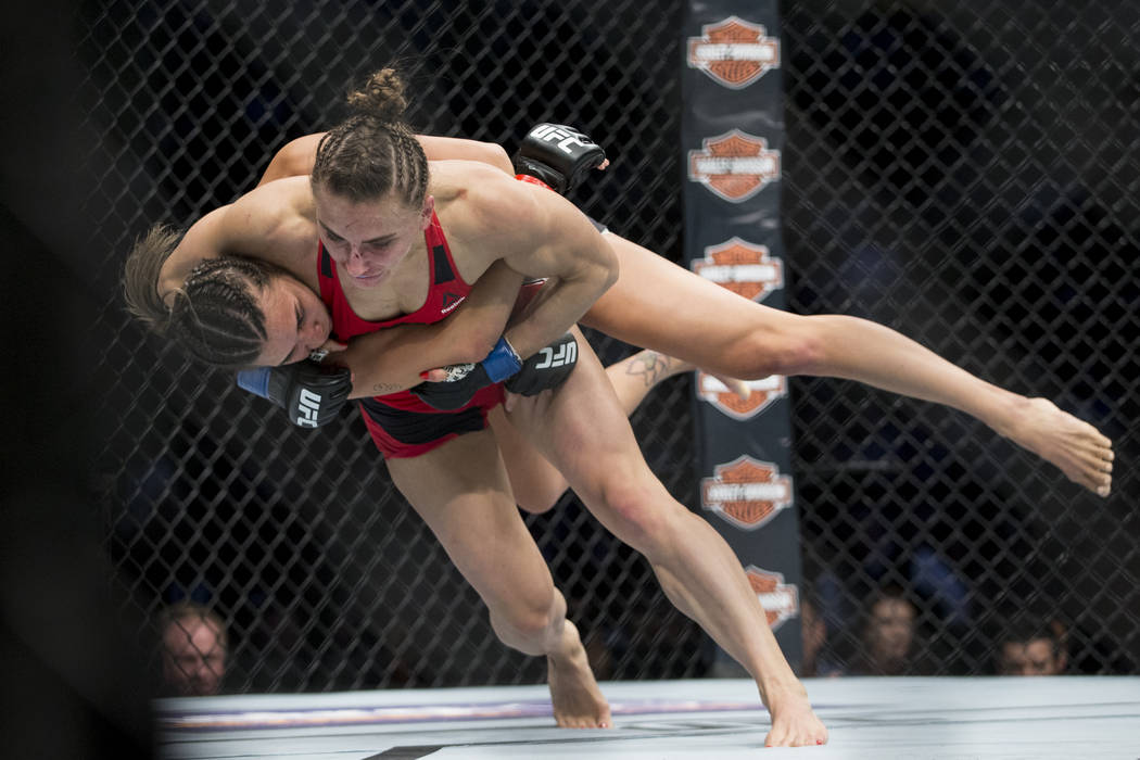 Justino stalked Tonya Evinger around the cage and punished her just about every time she dared slow down for even a brief moment. Justino finally finished her with two big right knees to the head at 1:56 of the third round, claiming the vacant women’s featherweight title.