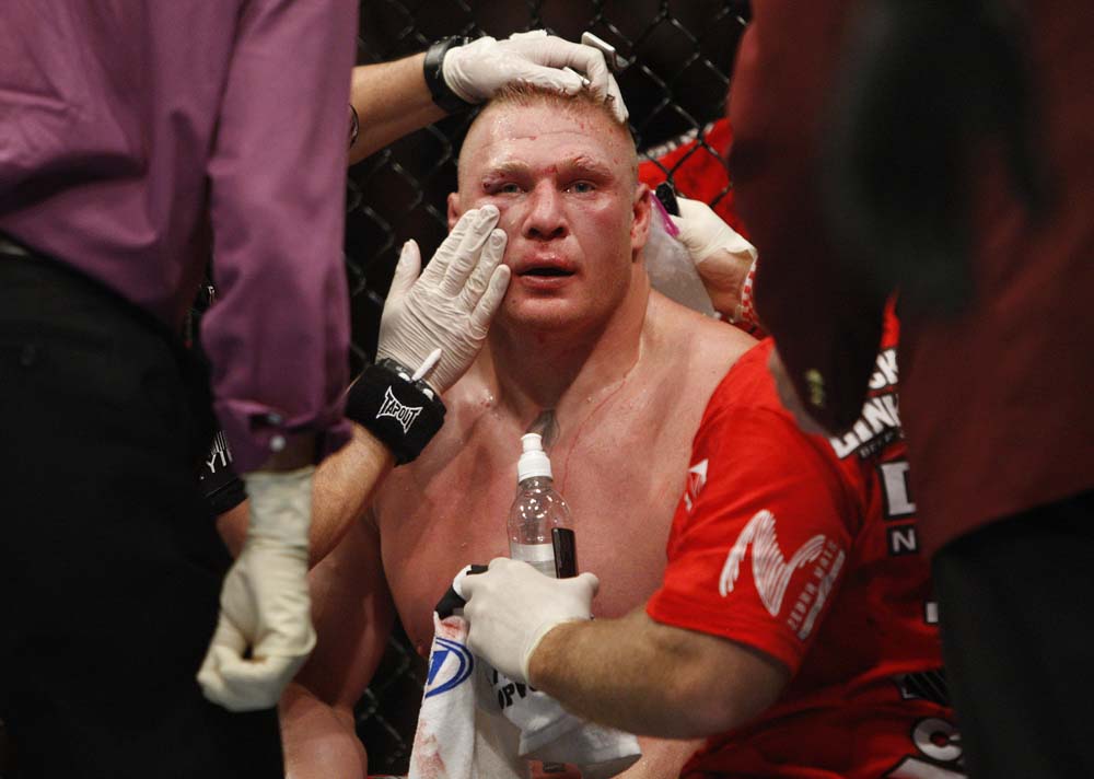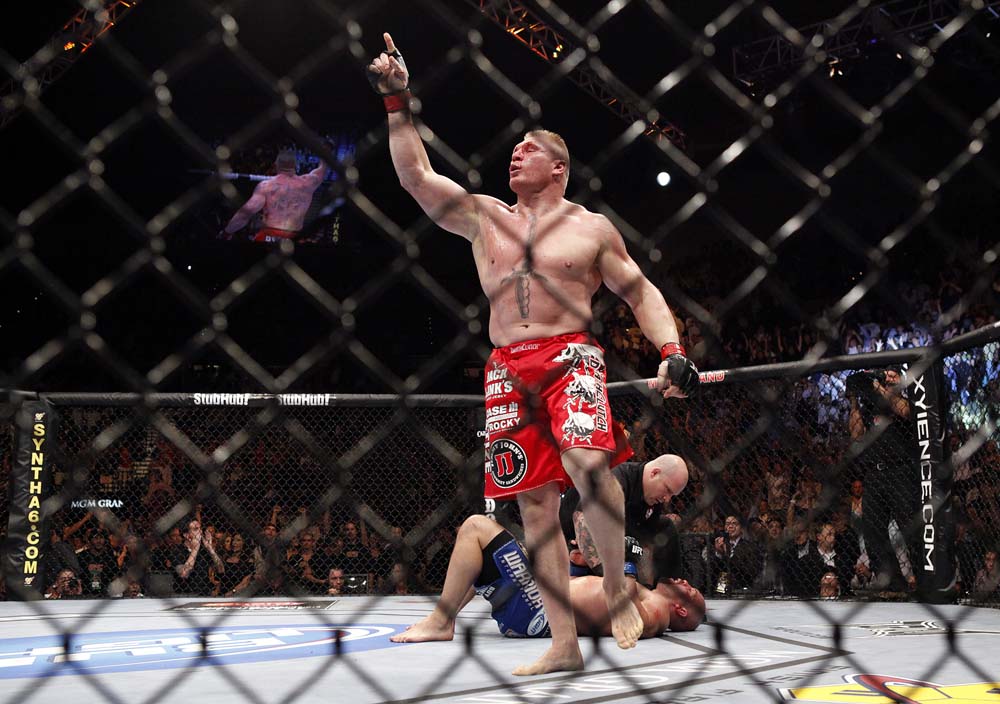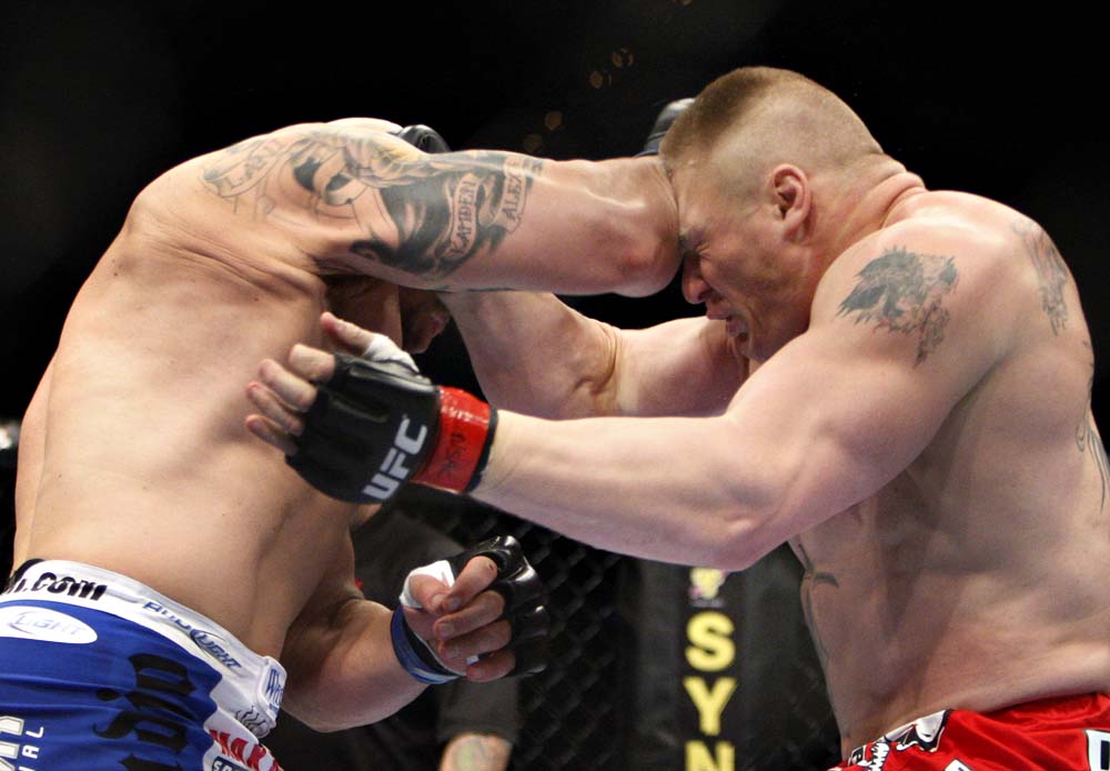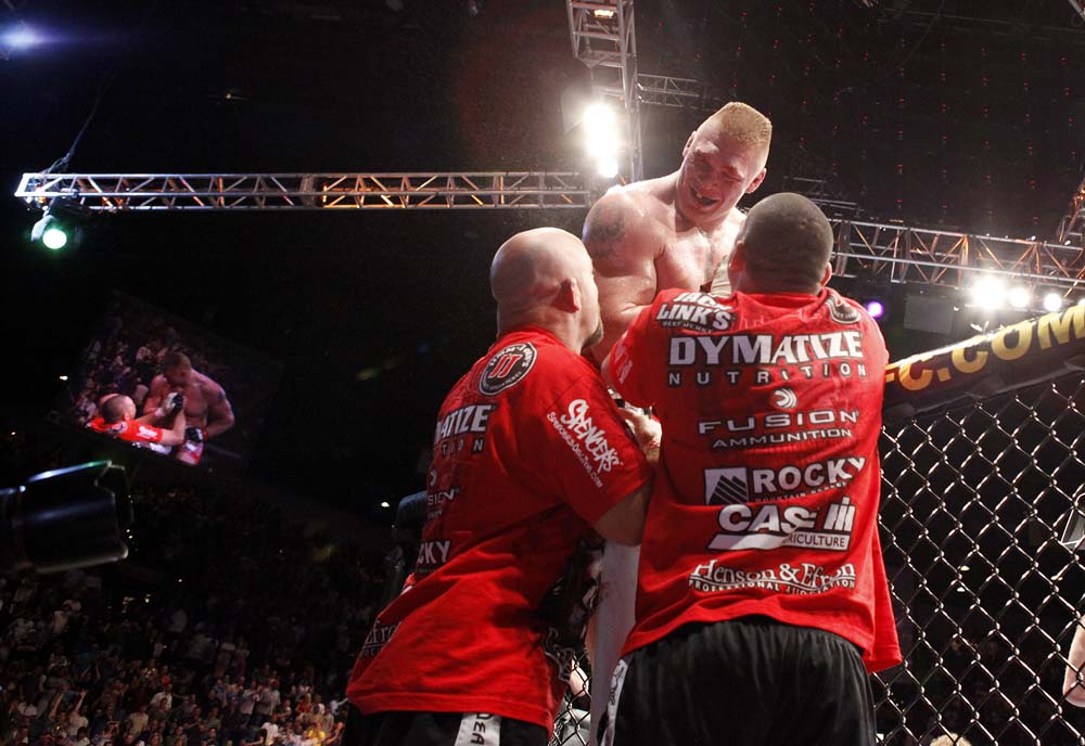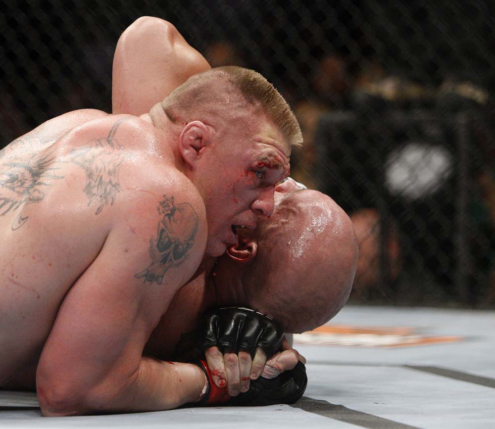 Brock Lesnar survived an onslaught of Shane Carwin punches in the first round and retained the Ultimate Fighting Championship heavyweight title in the main event of UFC 116 at the MGM Grand on Saturday night.