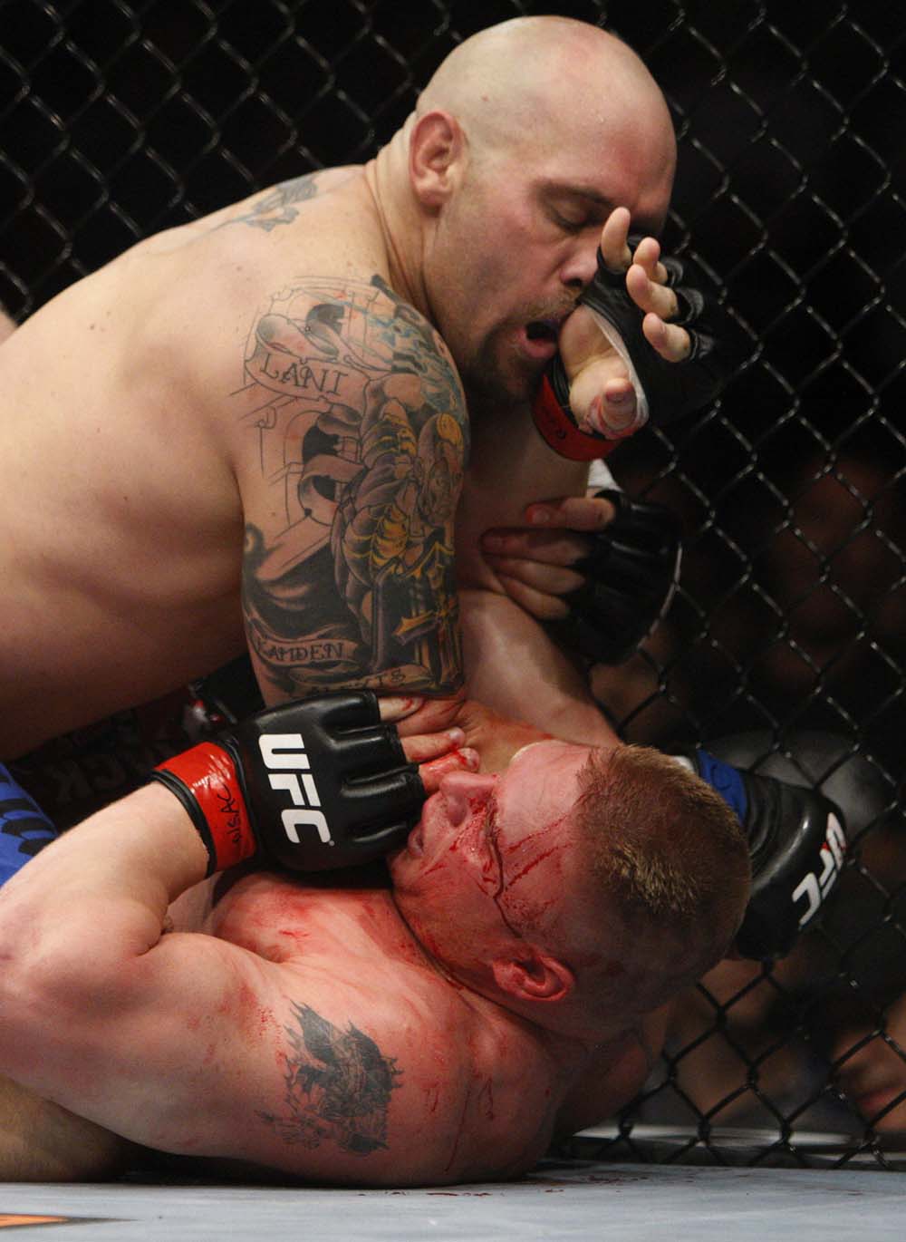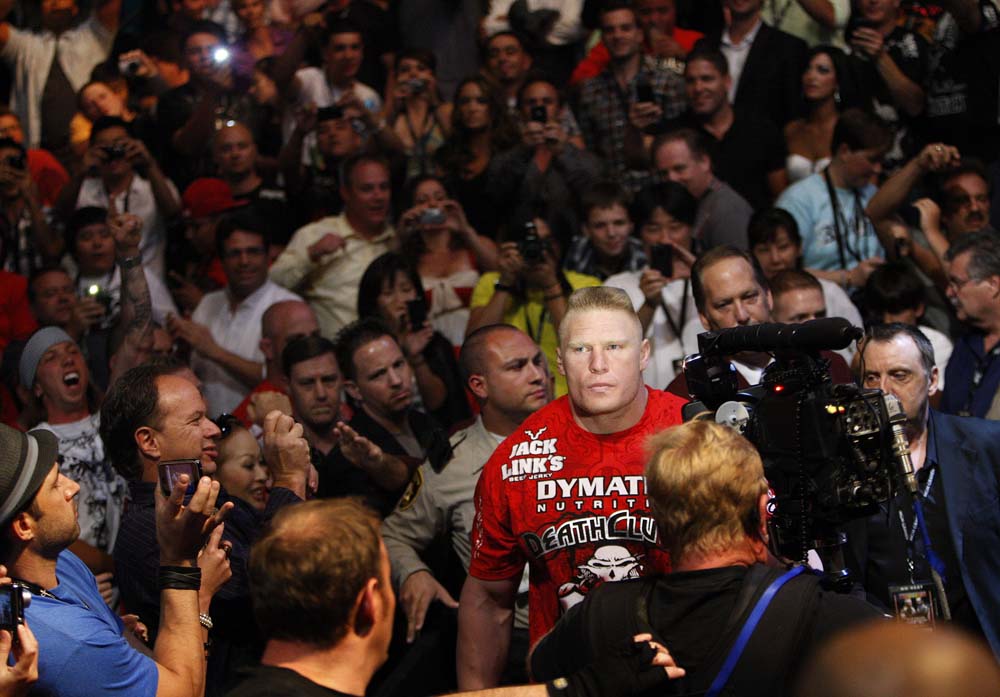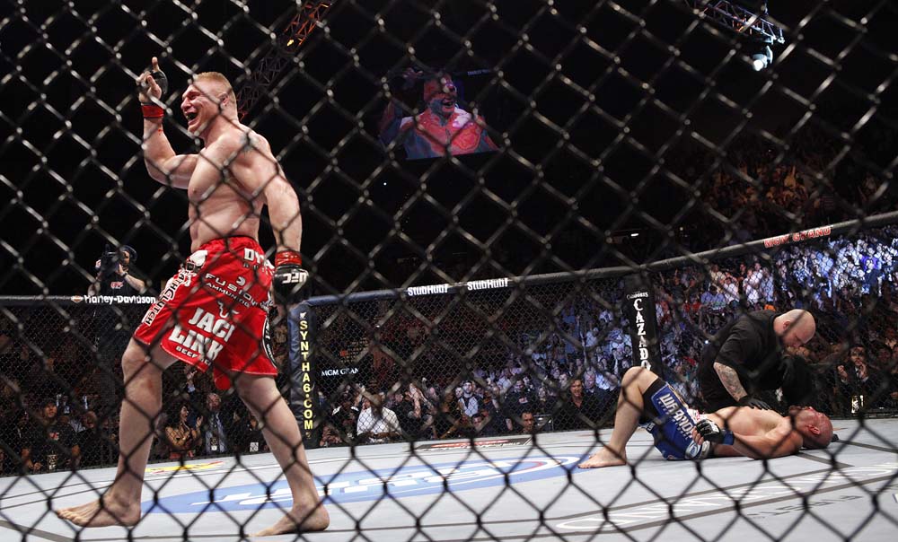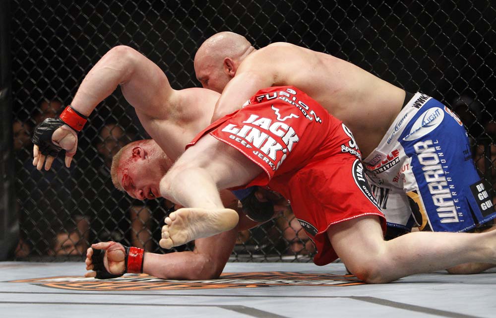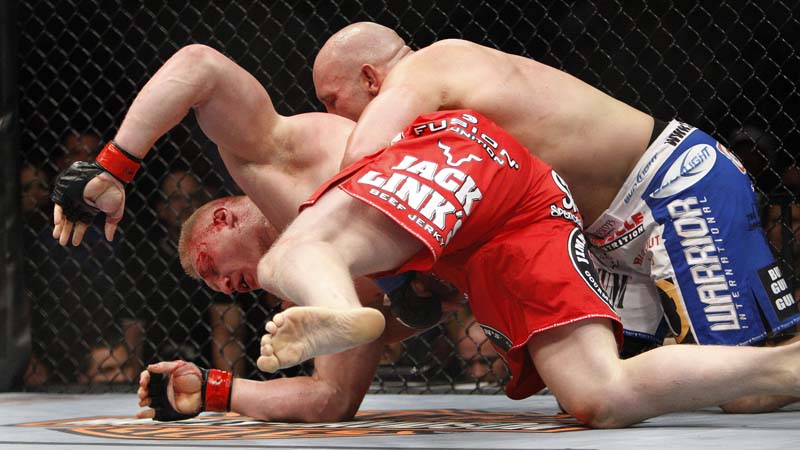 Brock Lesnar survived an onslaught of Shane Carwin punches in the first round and retained the Ultimate Fighting Championship heavyweight title in the main event of UFC 116 at the MGM Grand on Saturday night.