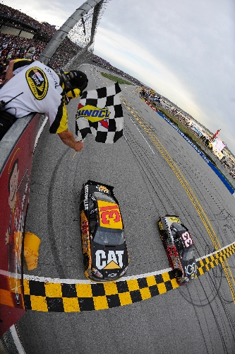 The race at NASCAR's biggest and fastest track finished roughly 30 minutes after the memorial service for two-time Indianapolis 500 winner Dan Wheldon ended in Indianapolis. Wheldon was killed in the IndyCar season finale a week ago at Las Vegas Motor Speedway, and NASCAR honored him with decals on all the cars and a moment of silence before the start of the race.