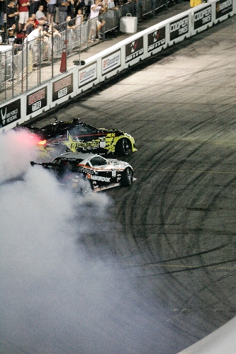 So is the concept of drifting. Racers can reach speeds of about 100 mph before intentionally sliding two at a time through corners, trying to come within a few inches of concrete guardwalls; the more extreme slides produce billowing clouds of tire smoke.