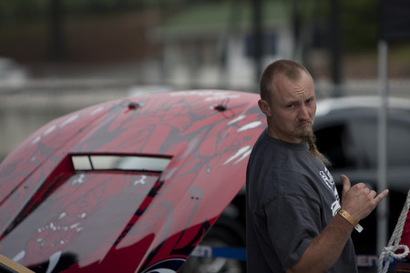One team competing in the Formula Drift All In event at the speedway's dragstrip pit area has tried to secure sponsors who fit its personality.