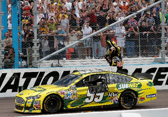 AVONDALE, Ariz. — Carl Edwards climbed from his car, stood on the door and landed a backflip near the finish line. He then hopped up on the wall in front of the grandstand, grabbed the checkered flag and waded into the crowd, trading high-fives with fans.