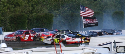 As Hamlin roared to the finish, a massive wreck behind him swallowed nine cars. Jeff Gordon, Mark Martin and Kasey Kahne were involved, with Kahne's No. 9 Ford briefly spinning atop the retaining wall after colliding with Richard Petty Motorsports teammate AJ Allmendinger.