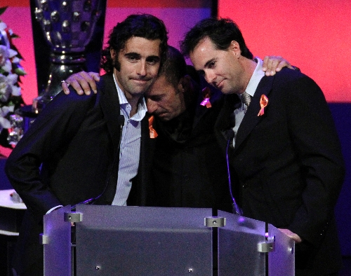 The stage was decorated with a Borg-Warner Trophy and a winner's wreath from the 500, two bottles of milk, symbolic of his two Indy wins, and Wheldon's 2005 points championship trophy.