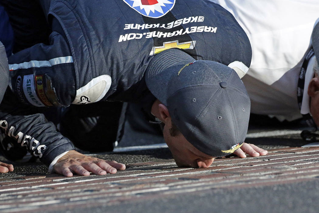 But even before kissing the bricks and posing for photos, Kahne’s long-awaited victory celebration was put on hold as he dropped to the ground and his crew members tried to rub out the cramps he fought through late in the race.