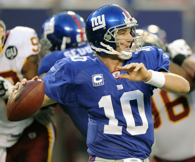 Brandon Jacobs rushed for 116 yards on 21 carries against the Redskins, but the Giants settled for three field goals in the first half. Manning completed 19 passes, 10 to Plaxico Burress.