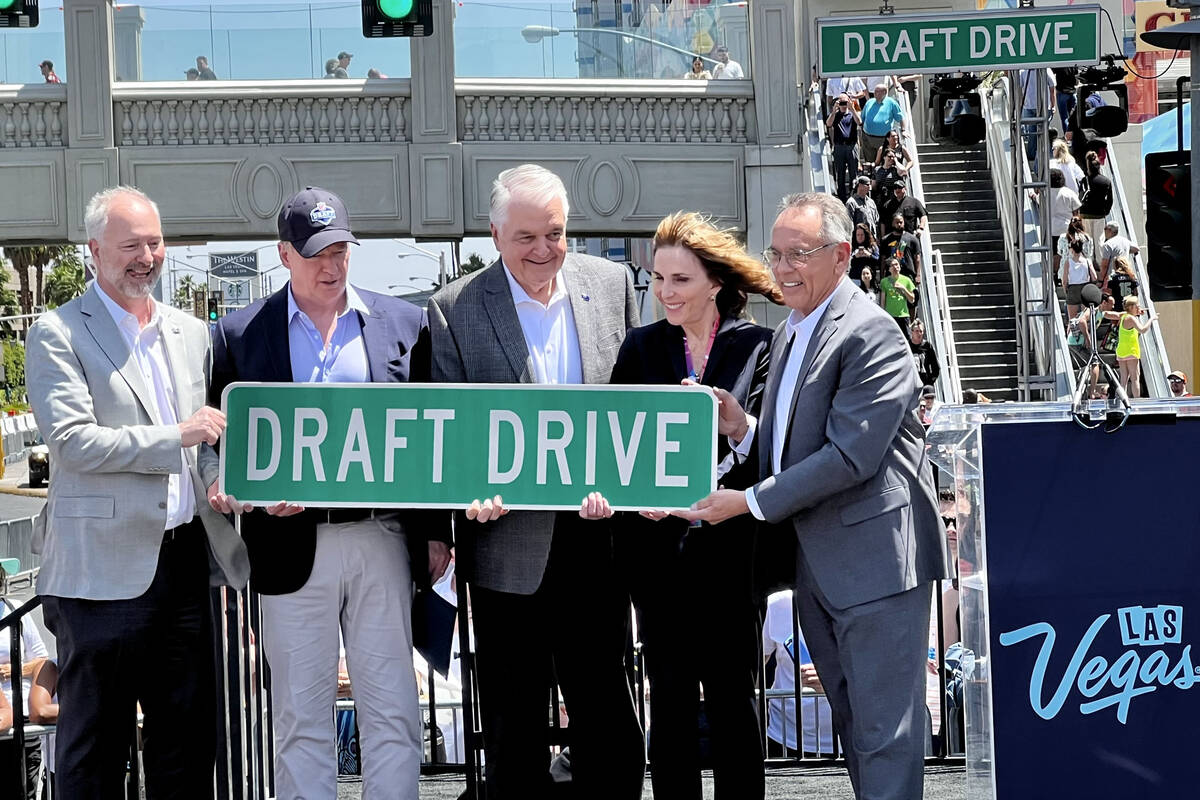 In what might be one of the most unique news conferences in Las Vegas history, officials kicked off NFL draft festivities Thursday from a stage in the intersection of Las Vegas Boulevard and Flamingo Road.