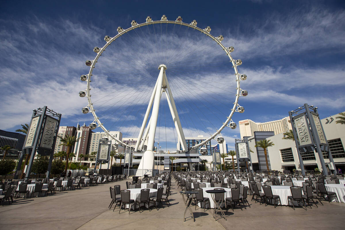 Chairs and tables are set at the Caesars Forum as the NFL Draft Theater, not pictured, is built on Monday, April 4, 2022, in Las Vegas. (Chase Stevens/Las Vegas Review-Journal) @csstevensphoto