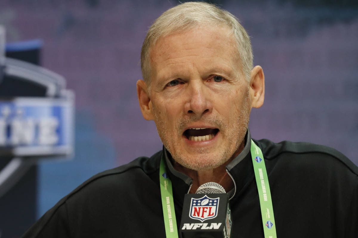 Las Vegas Raiders general manager Mike Mayock speaks at the NFL scouting combine at the Indianapolis Convention Center in Indianapolis, Ind., Tuesday, Feb. 25, 2020. (Heidi Fang /Las Vegas Review-Journal) @HeidiFang