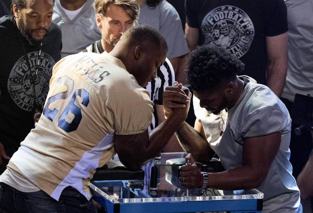 Former NFL running back Chris ‘Beanie’ Wells (26) and Kansas City Chiefs linebacker Justin March-Lillard, right, lock up their hands as referees Brian Brandon, striped shirt, and Herb Dean look on at the inaugural Pro Football Armwrestling Championship, which was filmed at the MGM Grand hotel-casino in Las Vegas, Nevada, on Apr. 8, 2017. Heidi Fang/Las Vegas Review-Journal @HeidiFang