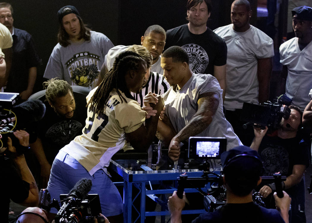 Tennessee Titans Jonathan Cyprien (37) and Seattle Seahawks linebacker Dewey McDonald, right, have a showdown at the inaugural Pro Football Armwrestling Championship, which was filmed at the MGM Grand hotel-casino in Las Vegas, Nevada, on Apr. 8, 2017. Heidi Fang/Las Vegas Review-Journal @HeidiFang