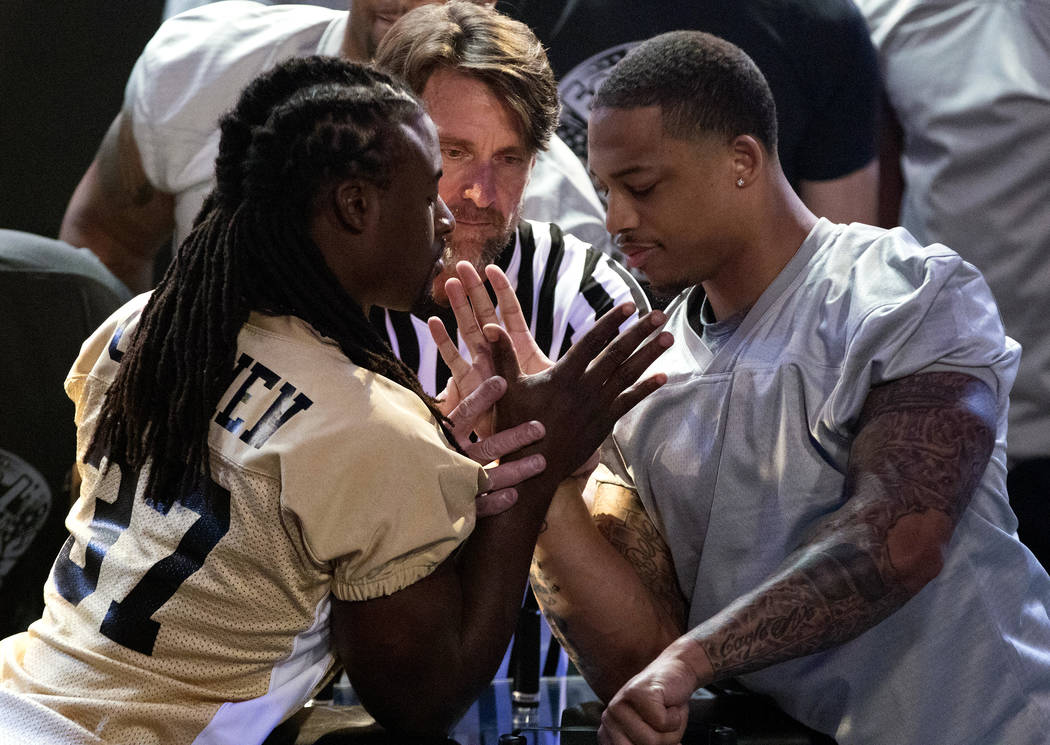 Former NFL running back Chris ‘Beanie’ Wells (26) and Kansas City Chiefs linebacker Justin March-Lillard are set by referee Brian Brandon as Herb Dean looks on at the inaugural Pro Football Armwrestling Championship, which was filmed at the MGM Grand hotel-casino in Las Vegas, Nevada, on Apr. 8, 2017. Heidi Fang/Las Vegas Review-Journal @HeidiFang