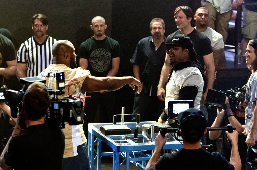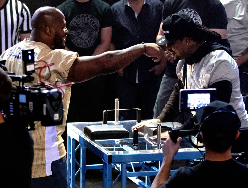 Team coaches and NFL player James Harrison, left, and former NFL running back Marshawn Lynch square off at the inaugural Pro Football Armwrestling Championship, which was filmed at the MGM Grand hotel-casino in Las Vegas, Nevada, on Apr. 8, 2017. Heidi Fang/Las Vegas Review-Journal @HeidiFang