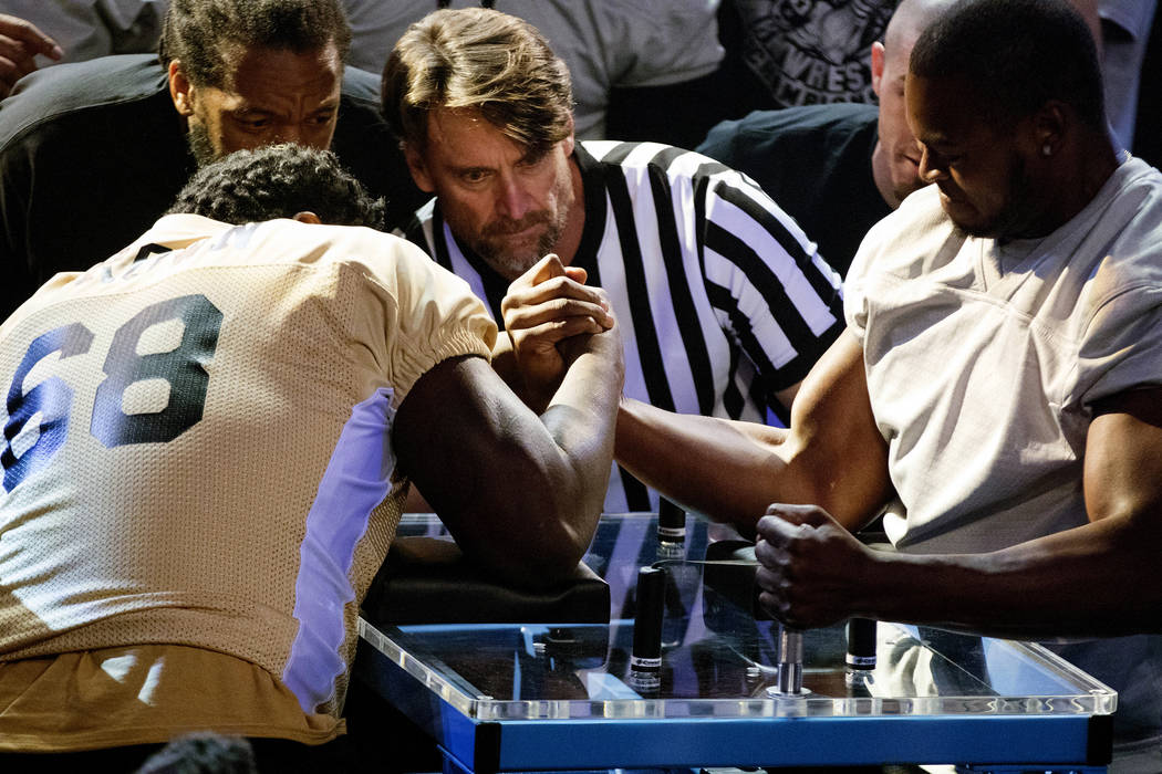 Referee Brian Brandon sets NFL safety Jonathan Cyprien, left, and linebacker Dewey McDonald, right, at the inaugural Pro Football Armwrestling Championship, which was filmed at the MGM Grand hotel-casino in Las Vegas, Nevada, on Apr. 8, 2017. Heidi Fang/Las Vegas Review-Journal @HeidiFang