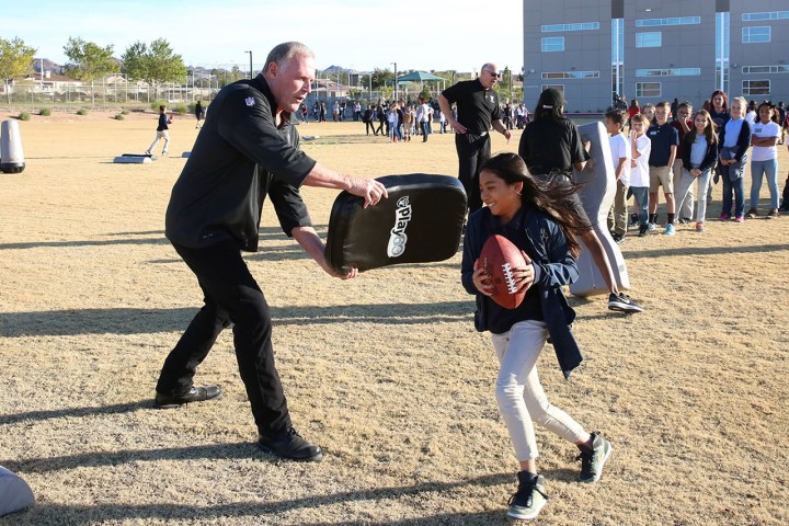 Four ex-players and members of the Raiderettes cheer students at Josh Stevens Elementary for logging 645,070 minutes of physical activity as part of the NFL Play 60 Challenge.