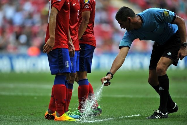 Vanishing spray is even more awesome than a striker named Fred. It is being used on free kicks, so opposing players forming the wall do not encroach on the player taking the free kick while the opposing players protect a certain area on their bodies with both hands.
