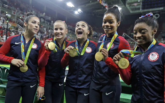 At the other end of Olympic Park, the U.S. women’s gymnastics team captured a second straight gold with a high-flying and dominating performance.