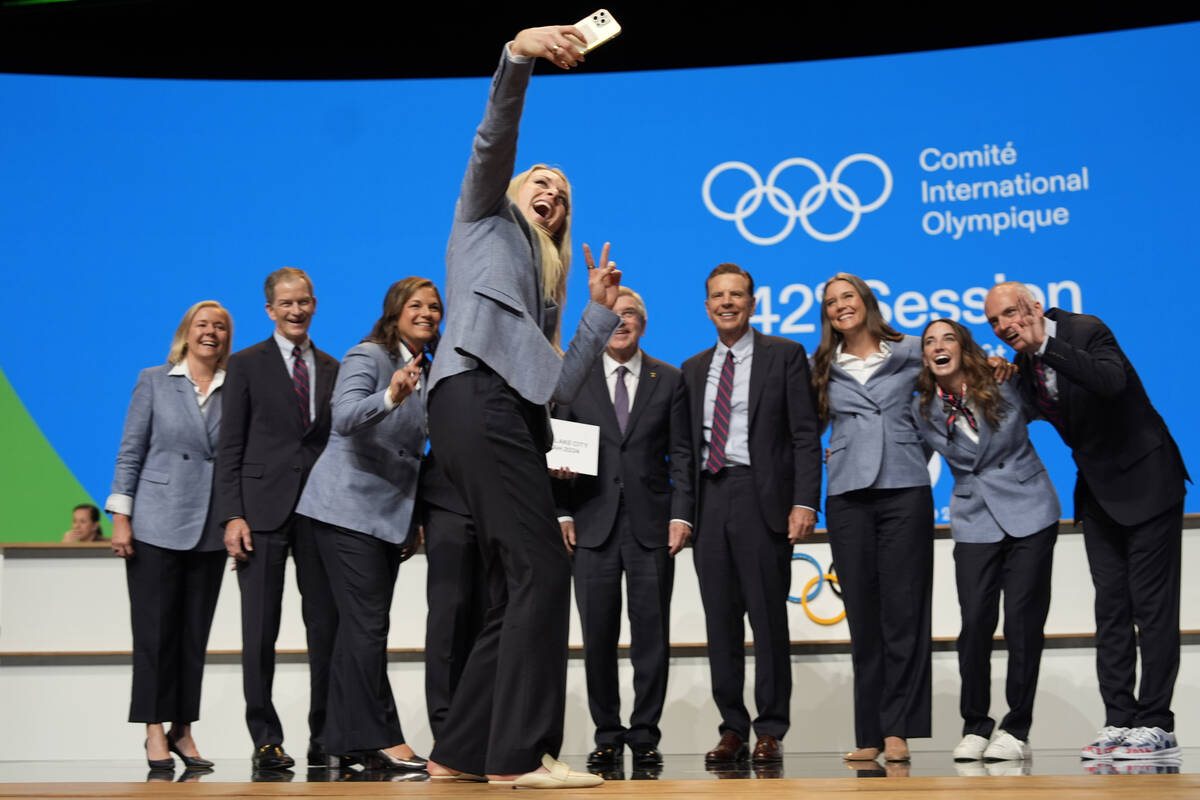 The campaign team presenting the bid on stage to IOC members included Cox, Salt Lake City Mayor Erin Mendenhall and Alpine ski great Lindsey Vonn. Back home, a 3 a.m. public watch party gathered to see the broadcast from Paris.