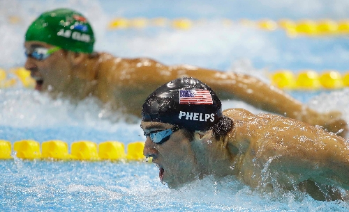 But the finish was a stunner, given that Phelps had won a memorable race at Beijing when a rival made the very same error. Milorad Cavic of Serbia thought he had the 100 fly in the bag after his final stroke, but Phelps made the split-second decision to get in one more stroke and slammed into the wall - one-hundredth of a second ahead of Cavic.