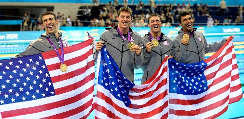 Lochte stood on the deck, waving his arms. Dwyer and Berens pumped their fists. And Phelps touched the wall for his first gold of the London Games with a cumulative time of 6 minutes, 59.70 seconds.