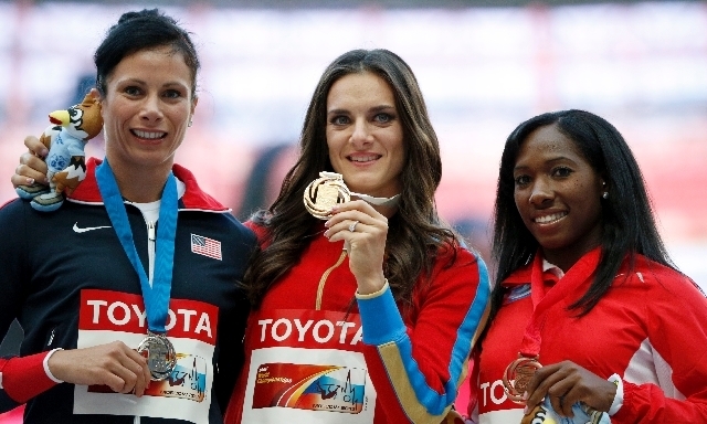 Before posing with American silver medalist Jenn Suhr and Cuban bronze medalist Yarisley Silva, Isinbayeva dried her eyes and then checked the tips of her fingers for smeared makeup. She was all smiles in the ensuing photos, and then addressed the adoring crowd, speaking into a microphone as her image was broadcast on giant screens.