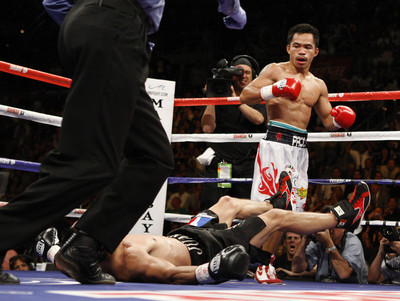But with 20 seconds remaining in the third round, Pacquiao sent Marquez down with a combination right jab and left cross to the chin.