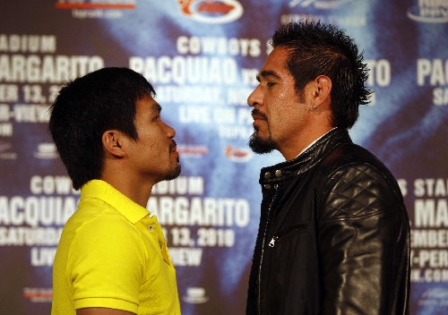 One reason was evident when the fighters exchanged handshakes and stood together. Both cracked up when they attempted the usual staredown pose, with Pacquiao laughing as he craned his neck to look up at Margarito, who's about 5 inches taller.