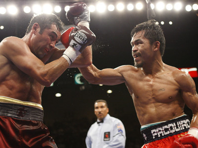 To his credit, De La Hoya kept coming. But while he remained on his feet, he was on the receiving end of a great deal of punishment. De La Hoya tried to rally late in the fifth round with one of his patented flurries, but Pacquiao not only withstood the attack, he answered with a couple of combinations.