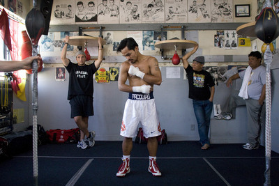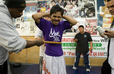 Yet he doesn't seem to mind having company. So as an overweight woman works out on a treadmill in an attempt to shed a few pounds, boxing's best performer is less than 10 feet away getting hit in the abdomen with a 1-inch-thick dowel by one of Roach's assistants. The exercise is painful to watch, and Pacquiao winces as he absorbs blow after blow.