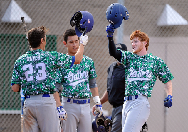 Green Valley’s Keaton Smith (4) celebrates with teammates Anthony Hatch (23) and Blake Inouye after hitting a home run against Rancho on Tuesday. The Gators won, 10-4. (David Becker/Las Vegas Review-Journal)