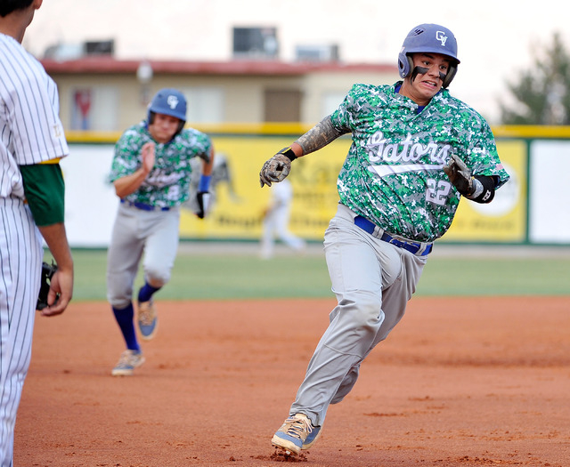 Green Valley’s Ty Burger (22) and Jarod Penniman run home after a triple by teammate Cody Milner on Tuesday. The Gators won, 10-4. (David Becker/Las Vegas Review-Journal)
