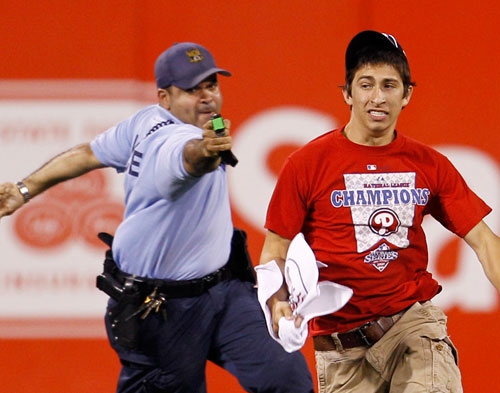PHILADELPHIA -- City police are considering whether officers should get involved when unruly but nonthreatening fans sprint onto the field during sporting events, a review begun after a teenager was subdued with a Taser at a Phillies game. A police officer used his stun gun Monday night on 17-year-old Steve Consalvi, who jumped onto the field and ran around in circles in the outfield. Police Commissioner Charles Ramsey examined video of the arrest and felt the officer acted within department guidelines.