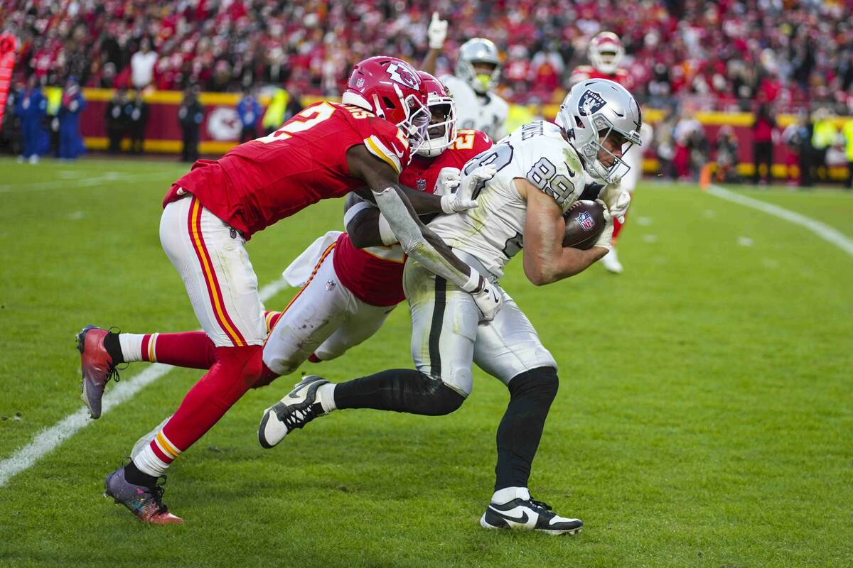 The Raiders’ miscues overshadowed an otherwise efficient day on both sides of the football. O’Connell completed 23 of his 35 passes for 340 yards and two touchdowns. The Raiders also held the Chiefs (11-1) to just one touchdown on five trips to the red zone.