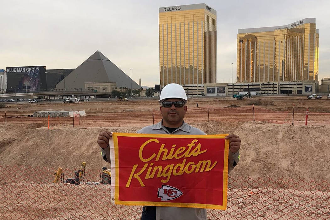 A Chiefs fan named Chris Scherzer posted a photo of a man wearing a white hardhat and dark glasses and holding a red and gold Chiefs banner with the inscription “Chiefs Kingdom” on his Facebook page. “Flag buried in dirt, encased in concrete, with a stadium built on top of it,” the message said. “Chiefs 1, Raiders 0. Las Vegas.”