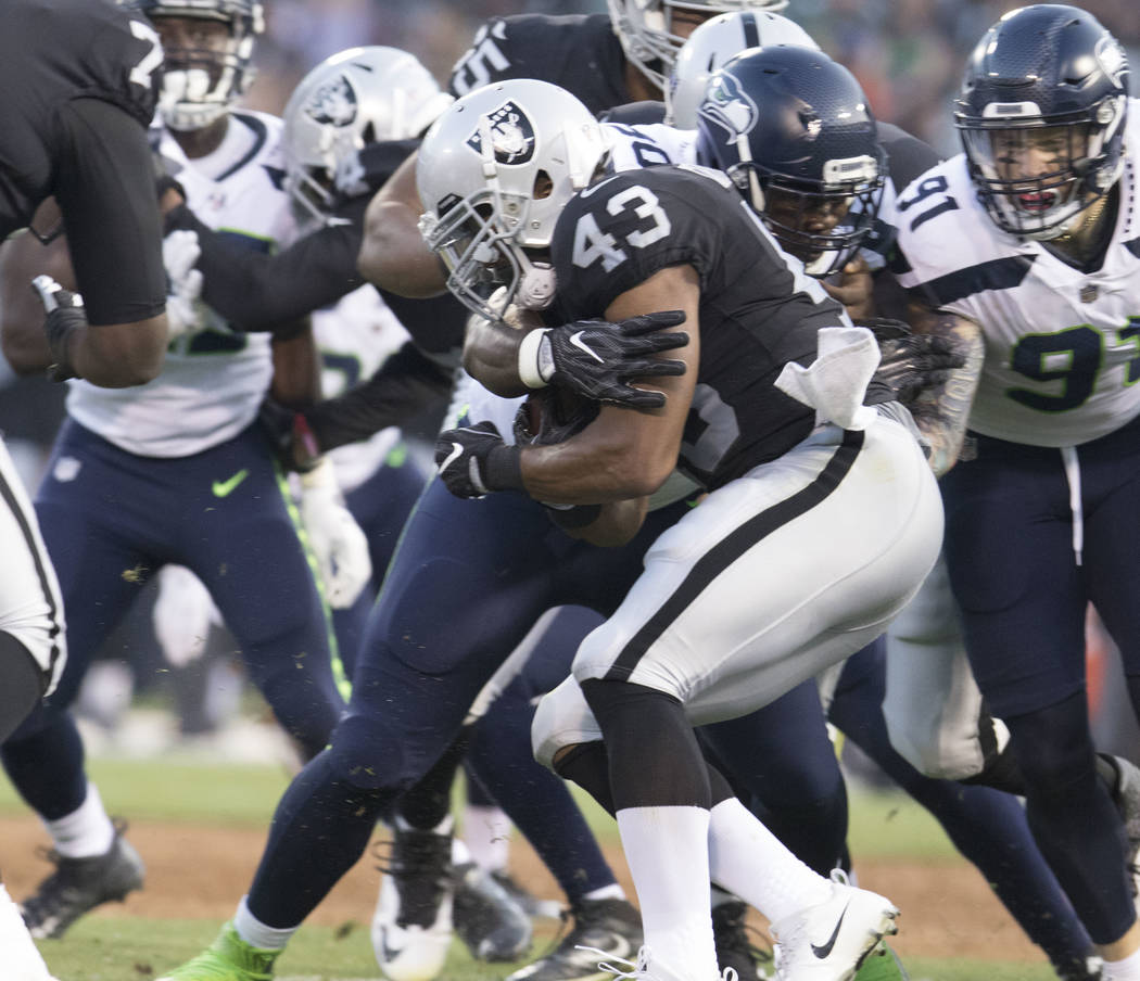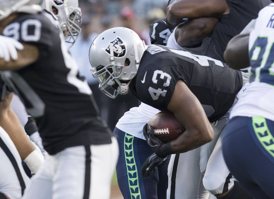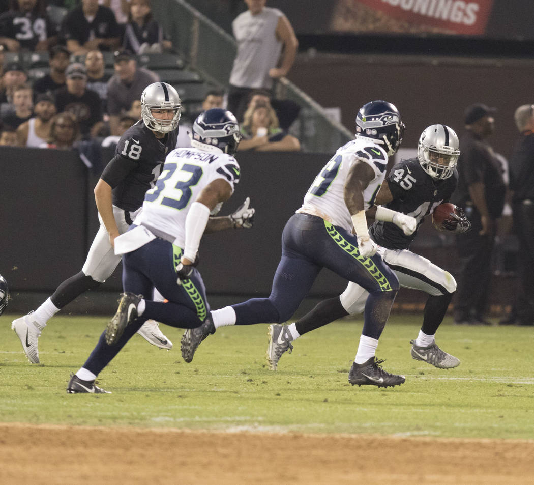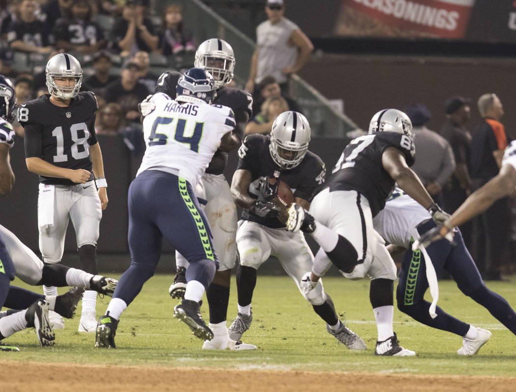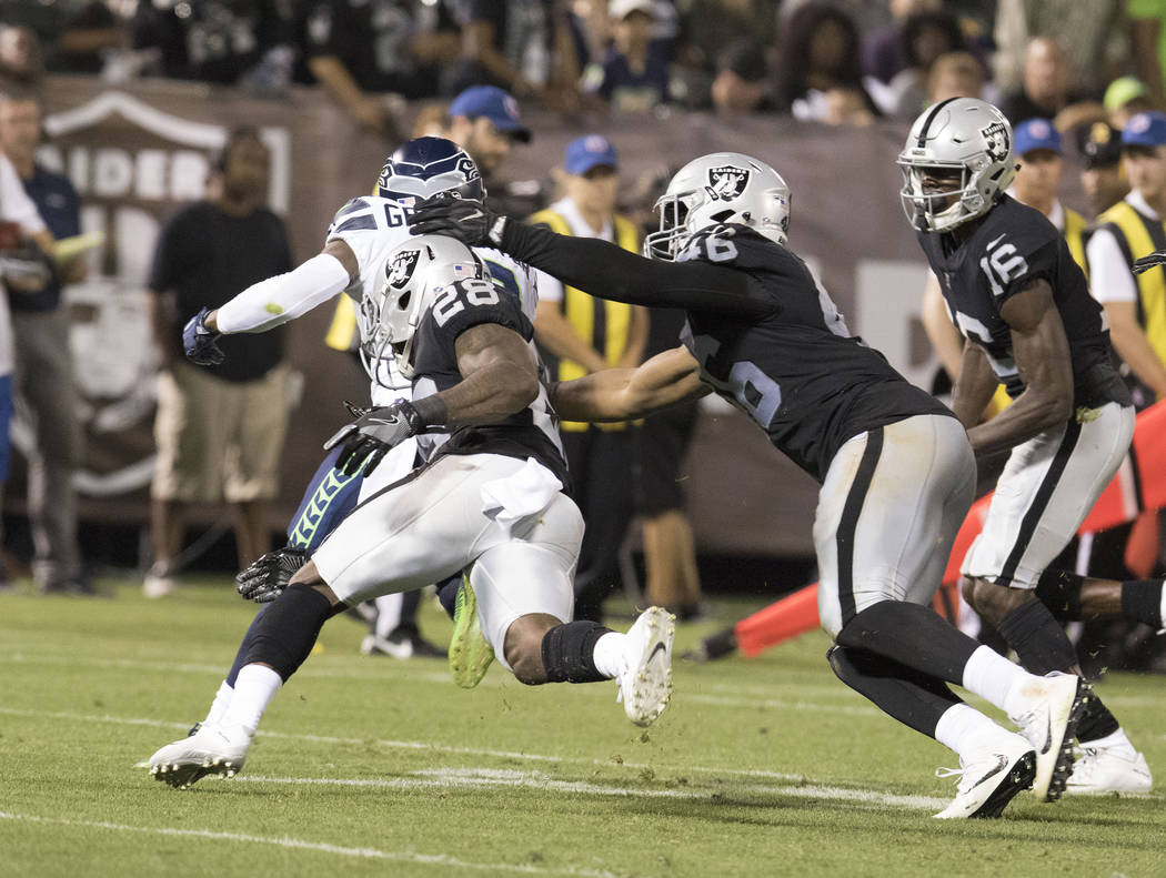 Running back George Atkinson III attempted to catch the opening kickoff. And he muffed it. The botched return forced the Raiders to start the evening at their own 11-yard line. Two plays later, running back John Crockett took a carry to the left side. And he fumbled it, setting up an easy Seattle Seahawks field goal.