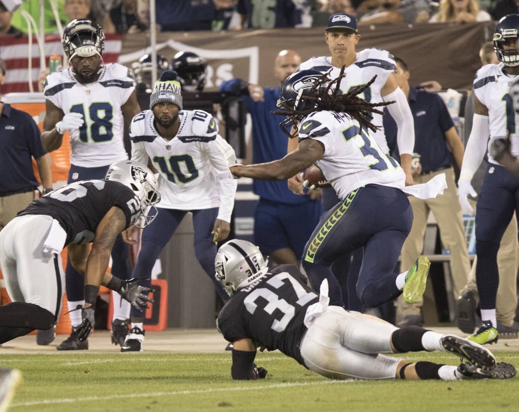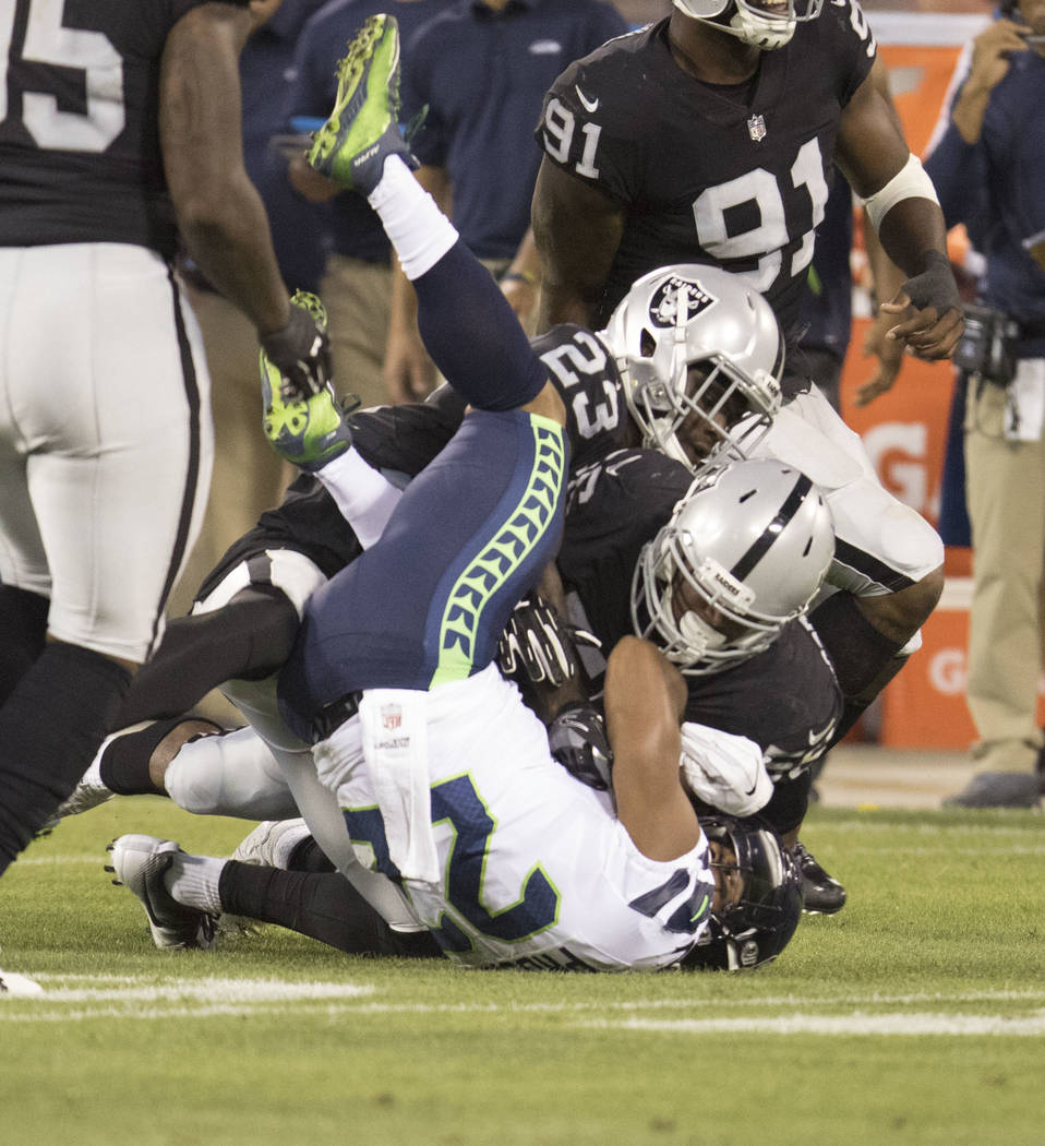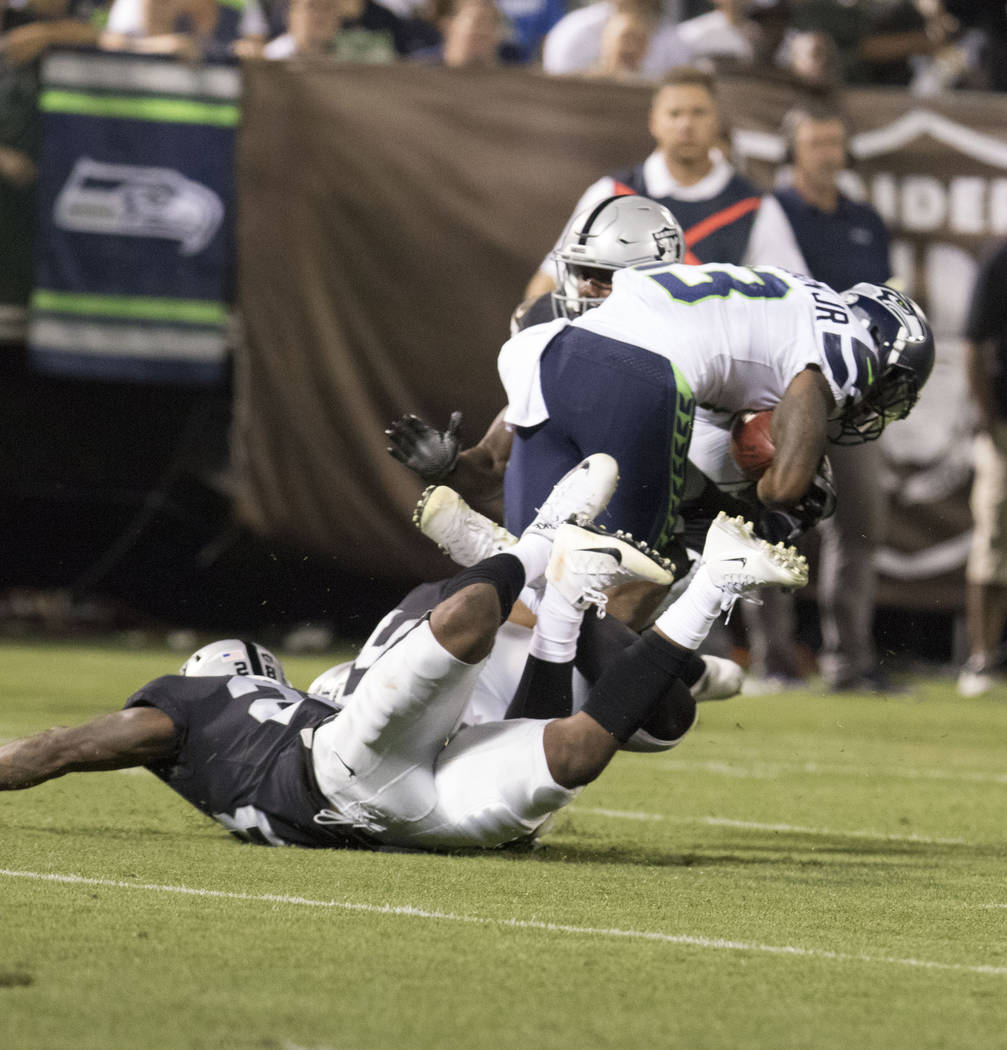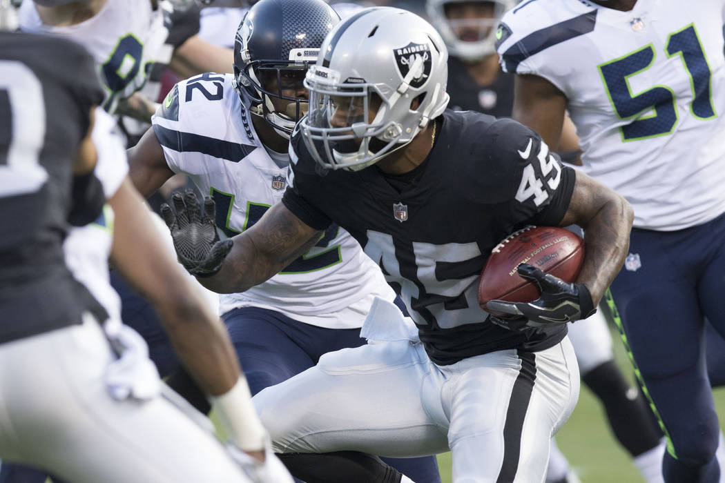 Running back George Atkinson III attempted to catch the opening kickoff. And he muffed it. The botched return forced the Raiders to start the evening at their own 11-yard line. Two plays later, running back John Crockett took a carry to the left side. And he fumbled it, setting up an easy Seattle Seahawks field goal.